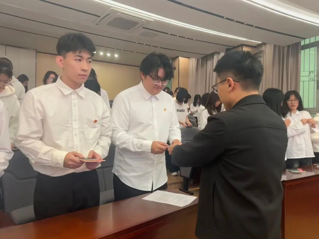 团组织迎来了一批新鲜血液,为共青团注入了新的活力。随后,廖小文老师与学生团委干部共同为新团员颁发了团章、团员证并佩戴团徽。团徽在胸前熠熠生辉,标志着荣誉与责任。在廖小文老师的带领下,全体新团员面向团旗,高举右拳庄严宣誓,铿锵誓言彰显赤诚决心。入团介绍人代表现场宣读了《中国共产主义青年团章程》中有关团员义务与权利的条款,引领新团员领悟团员的使命与担当。