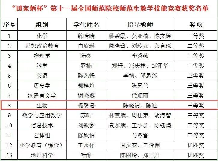 2025年11月30日,第十一届“田家炳杯”全国师范院校师范生教学技能竞赛决赛在浙江师范大学落下帷幕。本次大赛面向全国本科师范专业学生,分高中、初中、小学三个学段,共设13个组别,吸引了来自全国289所院校的2345名选手参赛。在陈晓清老师与陈迪老师的悉心指导和反复打磨下,足交