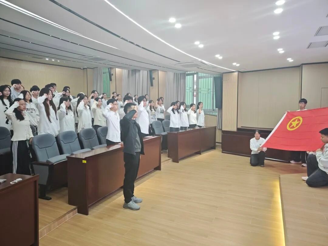 团组织迎来了一批新鲜血液,为共青团注入了新的活力。随后,廖小文老师与学生团委干部共同为新团员颁发了团章、团员证并佩戴团徽。团徽在胸前熠熠生辉,标志着荣誉与责任。在廖小文老师的带领下,全体新团员面向团旗,高举右拳庄严宣誓,铿锵誓言彰显赤诚决心。入团介绍人代表现场宣读了《中国共产主义青年团章程》中有关团员义务与权利的条款,引领新团员领悟团员的使命与担当。