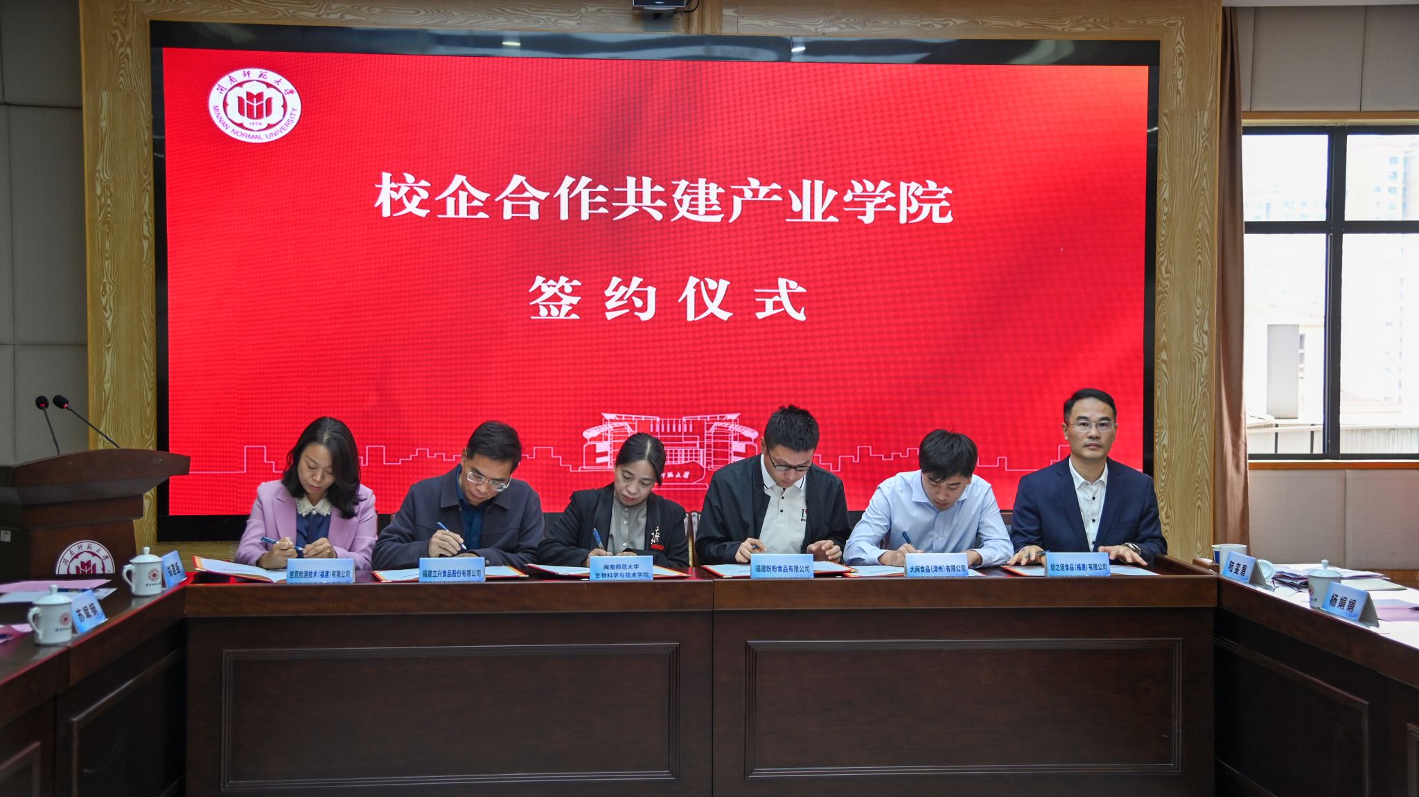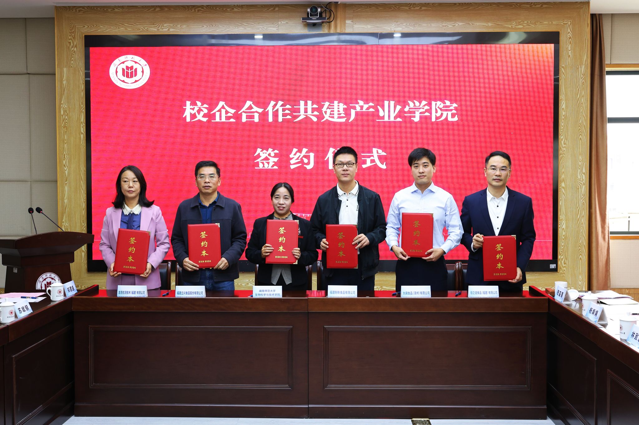 分别与大闽食品(漳州)有限公司、漳州市食品科学研究院、福建立兴食品股份有限公司、焙之道食品(福建)有限公司、吉克检测技术(福建)有限公司签署共建产业学院协议。