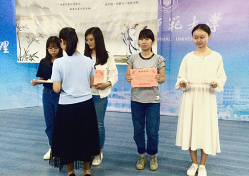 结业典礼之初全体师生颂国歌以示祖国永在我心,接着主持人宣读了结业发文,并由各组组长上台汇报关于“奋斗正当其时,圆梦适得其势”的实践总结。汇报完总结,主持人宣读了优秀学员发文,并邀请优秀学员上台分享心得。接着就进入优秀学员颁奖环节,由邱老师为优秀学员颁奖。