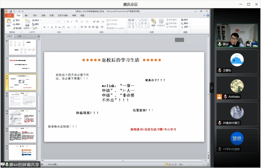 学生返校前,学院辅导员开展线上主题班会,详细解答返校注意事项和返校后的校园管理等。辅导员下宿舍,为学生宿舍提前通风,检查宿舍安全设备等。学院提前组织志愿者助力学生返校,召开学院新学期勤工工作会议,提前检查教室上课设备和做好卫生清洁工作。