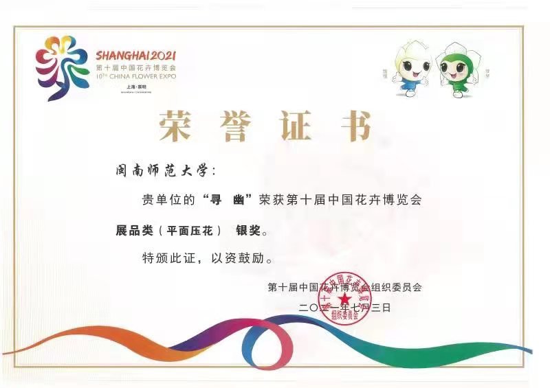 选送的切花、压花作品、组合盆栽作品荣获多个奖项。其中陆銮眉教授培育的“Laddawan火炬花”切花荣获银奖,邹金美副教授指导的压花作品“寻幽”、“一方清香”、“丹凤朝阳”、“紫气金牛”分获银奖和铜奖,陈郑镔老师指导的园艺专业学生王新哲、敬月美制作的组合盆栽作品“空林”、“镜花月影”获得优秀奖。