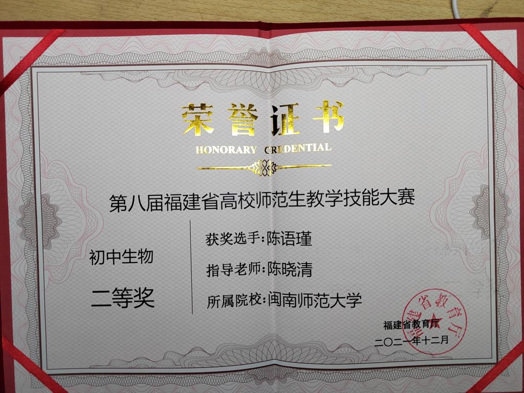 选派3名师范生参赛,与来自全省多所高校师范生展开激烈角逐,喜获佳绩。18级生科2班潘雪萍、陈语瑾均获初中生物组二等奖,18级生科2班黄洁玲获初中生物组三等奖。