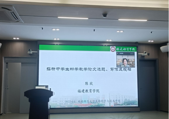 邀请,6月6日晚,福建教育学院陈欣教授在腾讯会议上作了题为《探析中学生物学教育论文选题写作及投稿》的讲座。相关师生聆听了此次报告,报告由张丹凤教授主持。