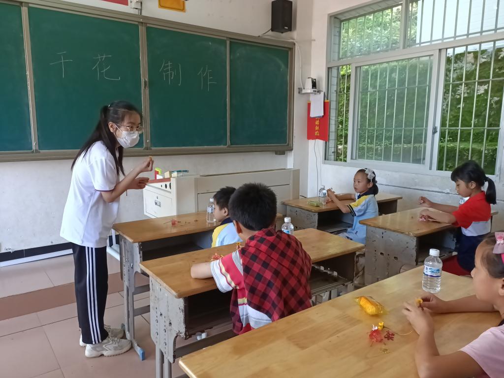 实践队成员秉持“自然教育”的理念在白石村和高田村开展了干花制作、植物拓印等实践活动,向学生科普其中的制作原理与技术,带领学生利用身边常见植物,制作成干花或通过拓印对布袋进行装饰。在愉悦身心、陶冶情操的同时,学会运用点、线、面为元素,相互结合进行构图,提高审美与创作能力,促进学生德智体美劳全面发展。