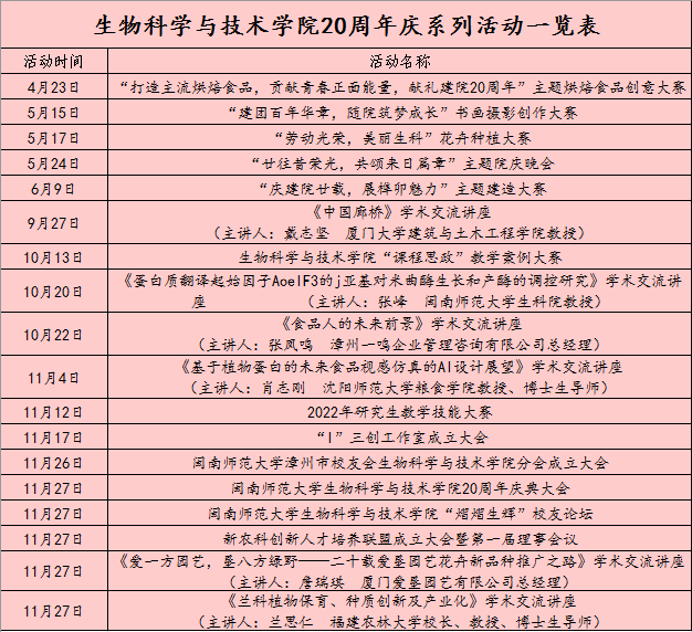 成立二十周年庆典系列活动从今年4月至11月持续进行,包含系列学术报告活动、特色党团学活动和主题晚会等。庆典当日还举办了校友论坛、学术报告等活动,并邀请了福建农林大学校长、教授、博士生导师兰思仁为在校师生和嘉宾作线上学术报告。