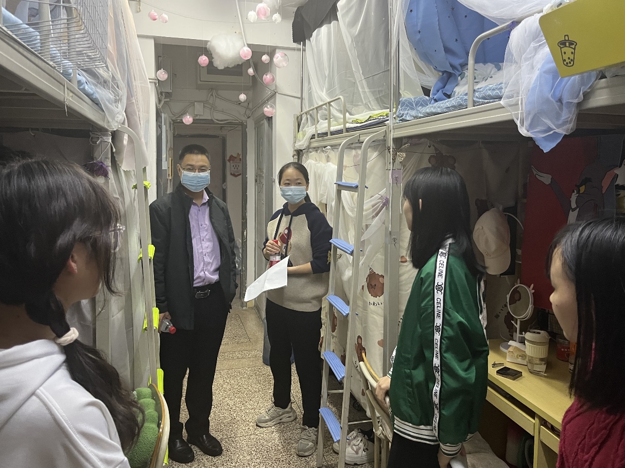 党政领导、辅导员和班主任老师深入学生宿舍区开展安全隐患排查和卫生检查,同时深入宿舍与学生谈心谈话,关心关注学生学习生活状况。