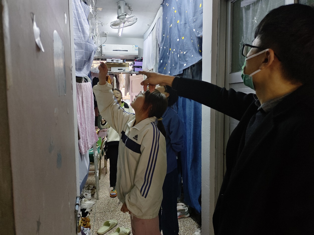 在瑞京宿舍区,学院党委副书记陈文婷带领全体辅导员检查学院宿舍区宣传栏、自律会办公室、学生宿舍内安全隐患点,重点排查是否存在停放电动滑板车及充电现象,提醒同学们不使用违规电器、不乱拉电线插座、不随意堆积杂物阻碍消防通道等。针对部分不规范、存在安全隐患的地方提出了详细的整改建议。