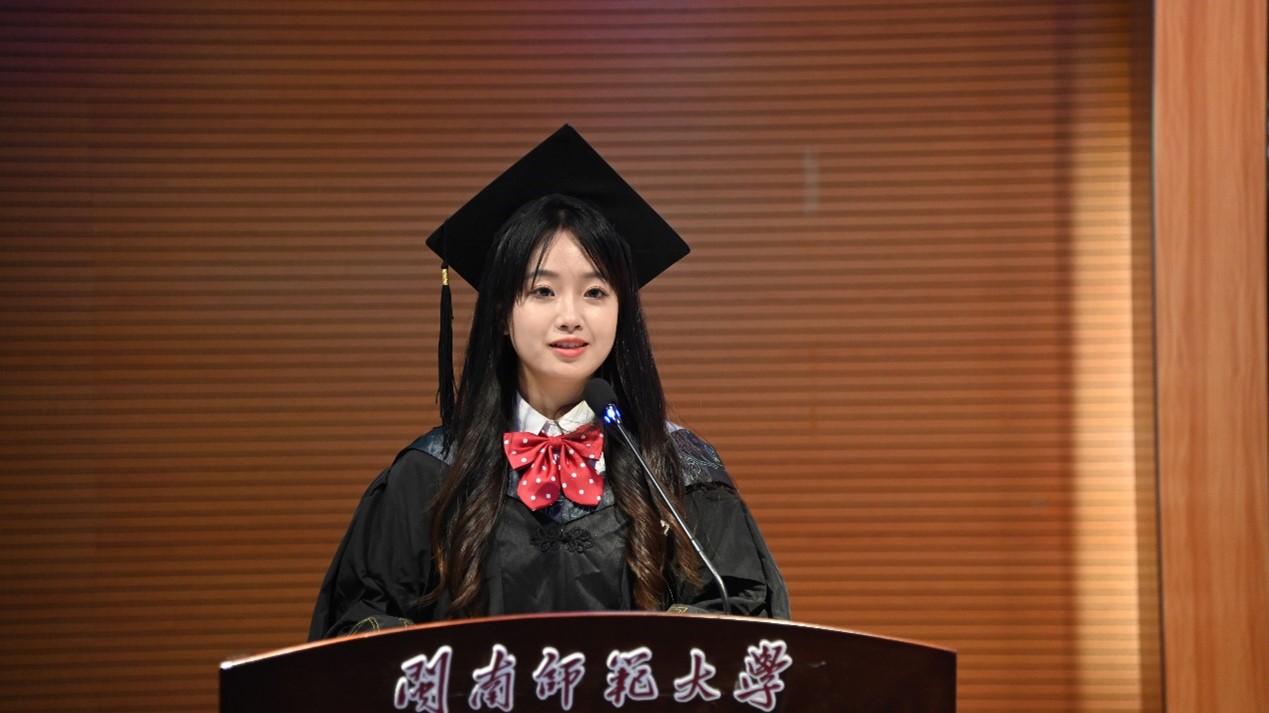 24届毕业生代表张晴雅首先对母校和老师表达了感谢。她回顾了大学四年充实的生活,用“学生物、知生物、爱生物”概括了她在生科院的全部历程,向自己交出了一份满意的答卷。最后,她向母校及学院、老师和全体毕业生送上衷心的祝愿。