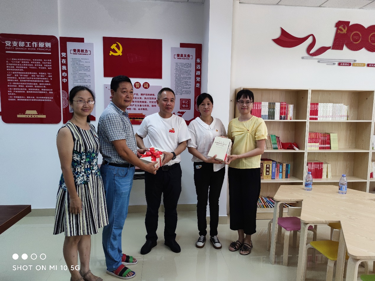 为了进一步推动党史和习近平法治思想学习教育,深刻领会中国共产党成功推进革命、建设、改革的宝贵经验,更好的营造学习教育氛围,2021年6月29日上午,菌物产业工程技术中心党支部向悠乐社区总支部委员会厦门商发物业管理有限公司党支部捐赠一批党史类书籍。悠乐社区总支部书记、厦门商发物业管理有限公司党支部书记、菌物产业工程技术中心党支部书记、支部委员等相关人员参加了赠书仪式。