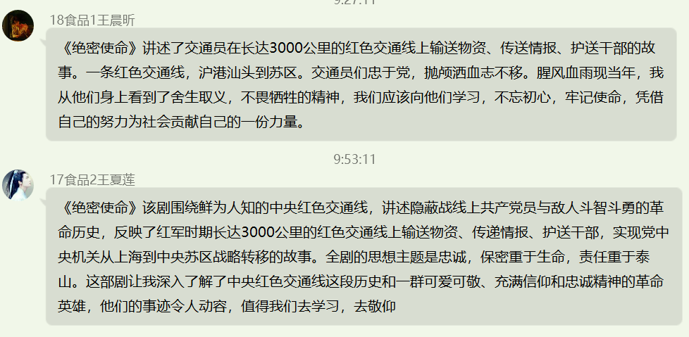 《绝密使命》聚焦鲜为人知的中央红色交通线,讲述了交通员在长达3000公里的红色交通线上输送物资、传送情报、护送干部的故事。观看结束后,同学们分享了自己感悟,并表示这些故事都是鲜活的党史,生动诠释了共产党人坚定不移的初心和以生命赴使命的担当精神。革命先辈们对信仰的忠诚让他们甘心为共产主义献出生命,我们要时刻学习防止思想滑坡,不忘初心牢记使命。