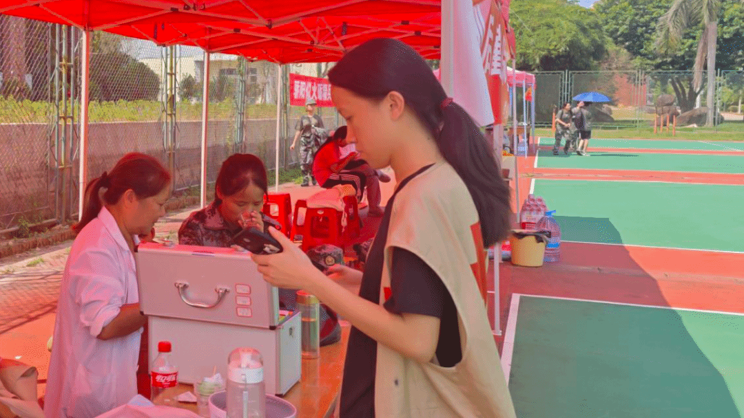 训练场上,除了刻苦训练的同学们,还有一群默默付出的身影——红十字志愿者。他们穿梭在队伍之间,时刻关注着同学们的身体状况。看到有同学因高温而脸色苍白,他们立刻上前,递上清凉的水,用温和的话语安抚,还熟练地为有小擦伤的同学消毒、包扎。在同学们训练疲惫时,志愿者们会送来精心准备的医疗箱,里面的防暑药品、创可贴等物资,为同学们的军训生活筑牢了健康防线。他们用专业与耐心,让军训场充满了温情,也让同学们能更安心、更有力量地投入到训练中。