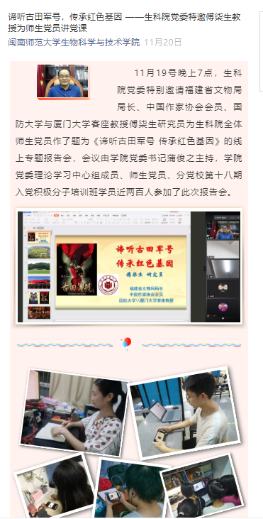 (3)谛听古田军号,传承红色基因 ——生科院党委特邀傅柒生教授为师生党员讲党课(2020.11.20)