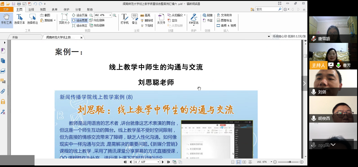 线上教学质量案例汇编》系列,集中学习了新闻传播学院刘思聪老师的《线上教学中师生的沟通与交流》、马克思主义学院郑育琛老师的《三三制模式总结与反思》、本系陈凡老师《概率论》线上课程案例与经验分等优秀教学案例。