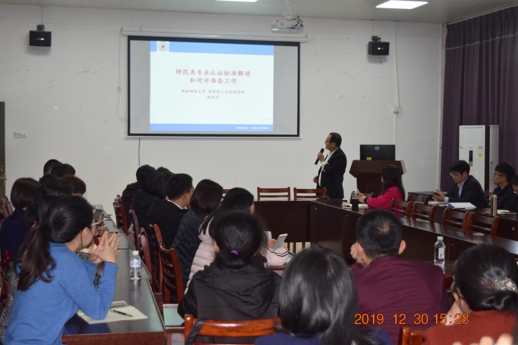 作题为《师范类专业认证标准解读和迎评准备工作》的专题讲座。学院领导、生科专业全体老师、行政和实验室相关人员参加讲座。