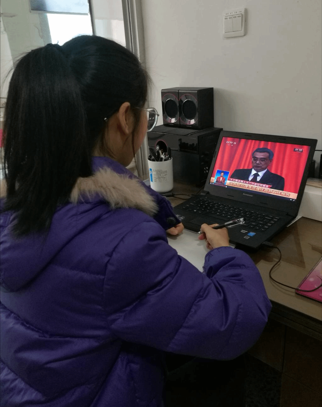 直播中,人民大会堂气氛庄重热烈,主席台帷幕正中的国徽在鲜艳的红旗映衬下熠熠生辉。李克强总理的工作汇报更是振奋人心,让在座的师生们更加坚信以习近平同志为核心的党中央领导必将带领中国走向繁荣昌盛。