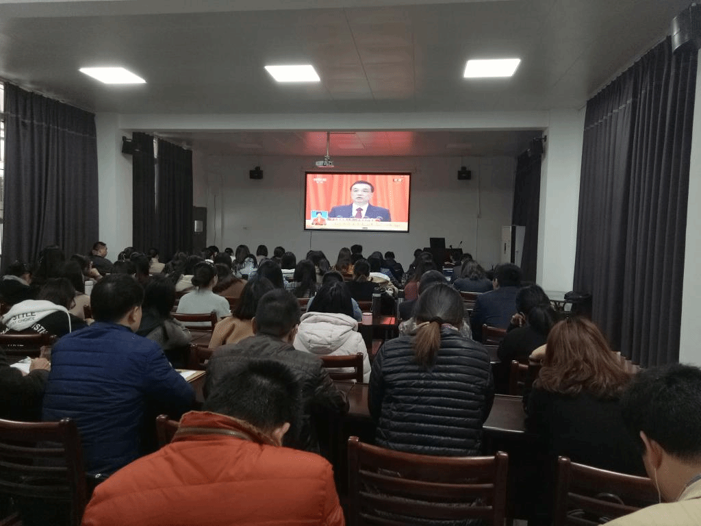 师生们神情庄重,聚精会神;观看后,大家积极讨论,均表态将认真贯彻两会精神并落实到教育工作和学习、生活中。