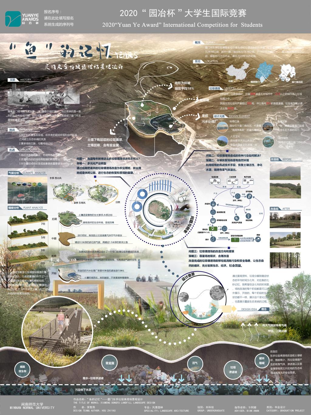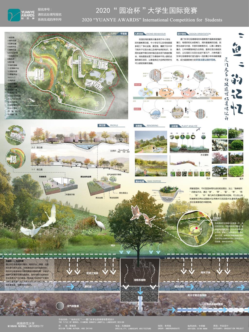 侯智尧同学在卞阿娜副教授的指导下,凭借作品《鱼”的记忆——厦门东孚垃圾填埋场景观设计》获得2020“园冶杯”大学生国际竞赛毕业设计作品三等奖。田亚齐同学在俞晓牮副教授的指导下,凭借作品《云的守护》获得2020“园冶杯”大学生国际竞赛课程设计作品荣誉奖。