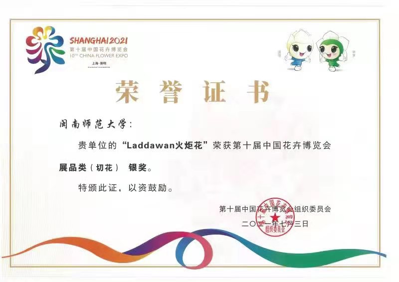 选送的切花、压花作品、组合盆栽作品荣获多个奖项。其中陆銮眉教授培育的“Laddawan火炬花”切花荣获银奖,邹金美副教授指导的压花作品“寻幽”、“一方清香”、“丹凤朝阳”、“紫气金牛”分获银奖和铜奖,陈郑镔老师指导的园艺专业学生王新哲、敬月美制作的组合盆栽作品“空林”、“镜花月影”获得优秀奖。