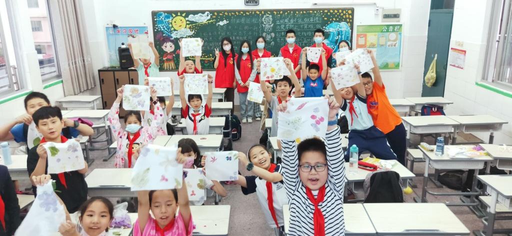 设计的奇趣乐园课堂内容设计了四期。第一期活动为“自制小花园”,志愿者教同学们做一个微景观花园,以此为例深入浅出地将生态系统的知识点教授给他们。同学们精心规划花园的布局,用花苗、苔藓、装饰品等做出了自己各具特色的小花园。第二期活动为“微生物小课堂”,在课堂上学习了微生物类别、导致的疾病,让学生观察手部细菌在培养基上的生长,见微知著。在第二周时,恰逢六一儿童节,志愿者将课后延时服务与学生欢度六一活动结合。志愿者主持,同学们纷纷大显身手,朗诵、歌唱、乐器演奏......第三期的活动为“拓印”,志愿者向学生科普了众多植物种类,学生用不同植物叶片、花瓣在手帕上构成图像,以植物花青素、叶绿素为颜料作画,制作精美手帕。第四期活动为“制作香包”,小朋友们认识了香料,辨别和感受各种香料的独特气味。同学们自行设计了香包的图案主题,有端午节主题的,有为爸爸准备的父亲节礼物,搭配不同的香料比例,做出了各有千秋的香包。