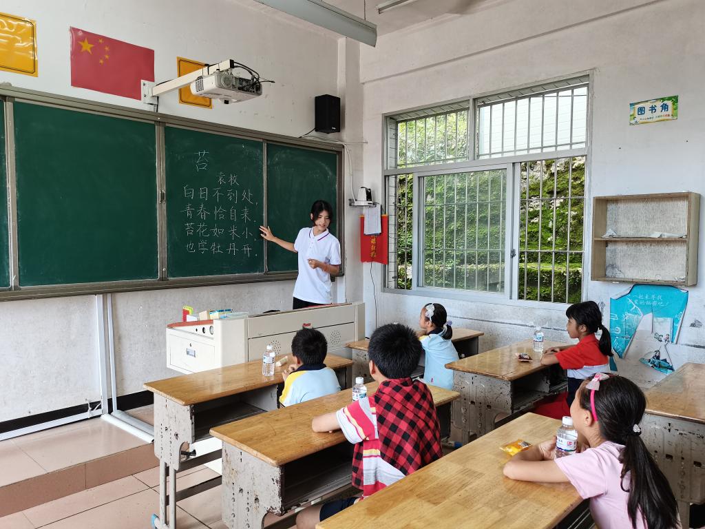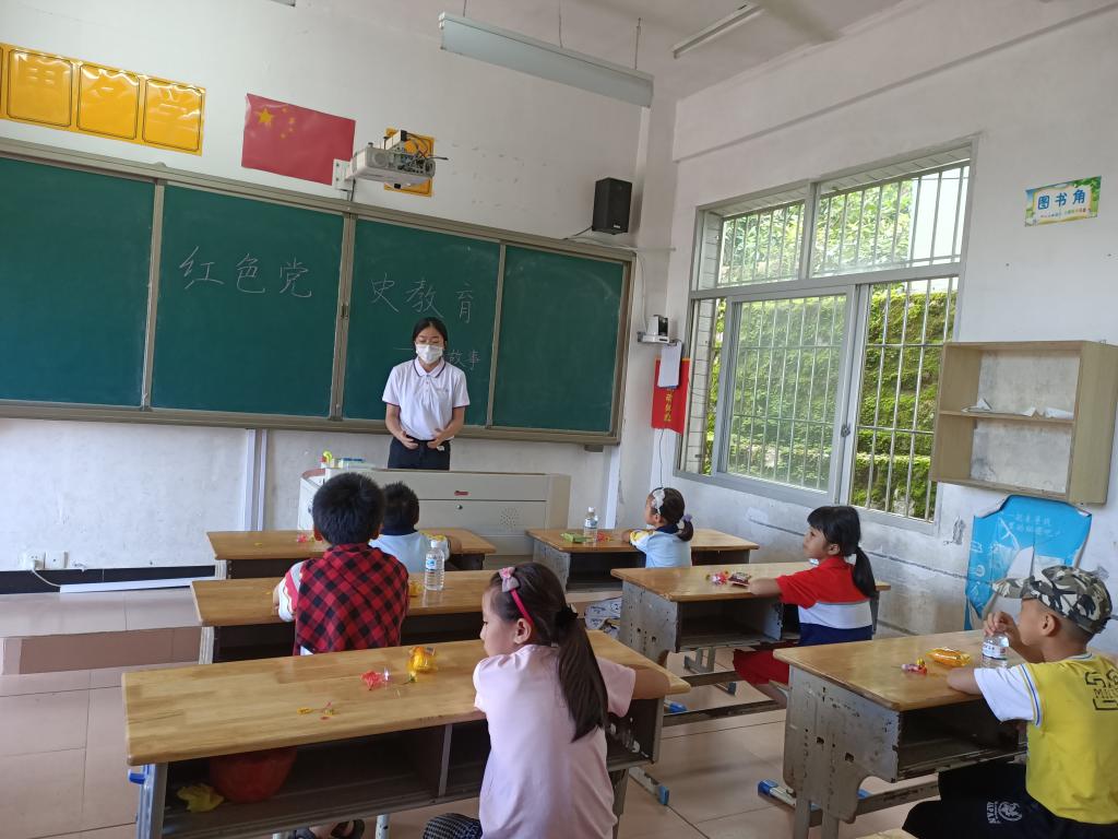 习近平总书记曾说:“我们党的每一段革命历史,都是一部理想信念的生动教材。”为使更多青少年以史为镜、以史明志,自觉用中华优秀传统文化、革命文化、社会主义先进文化培根铸魂、启智润心。实践队成员在村落面向学生开展党史学习教育,深入挖掘云霄当地红色资源,讲述红色故事,使学生坚定信念,拥护党的领导,传承革命精神,赓续红色血脉。