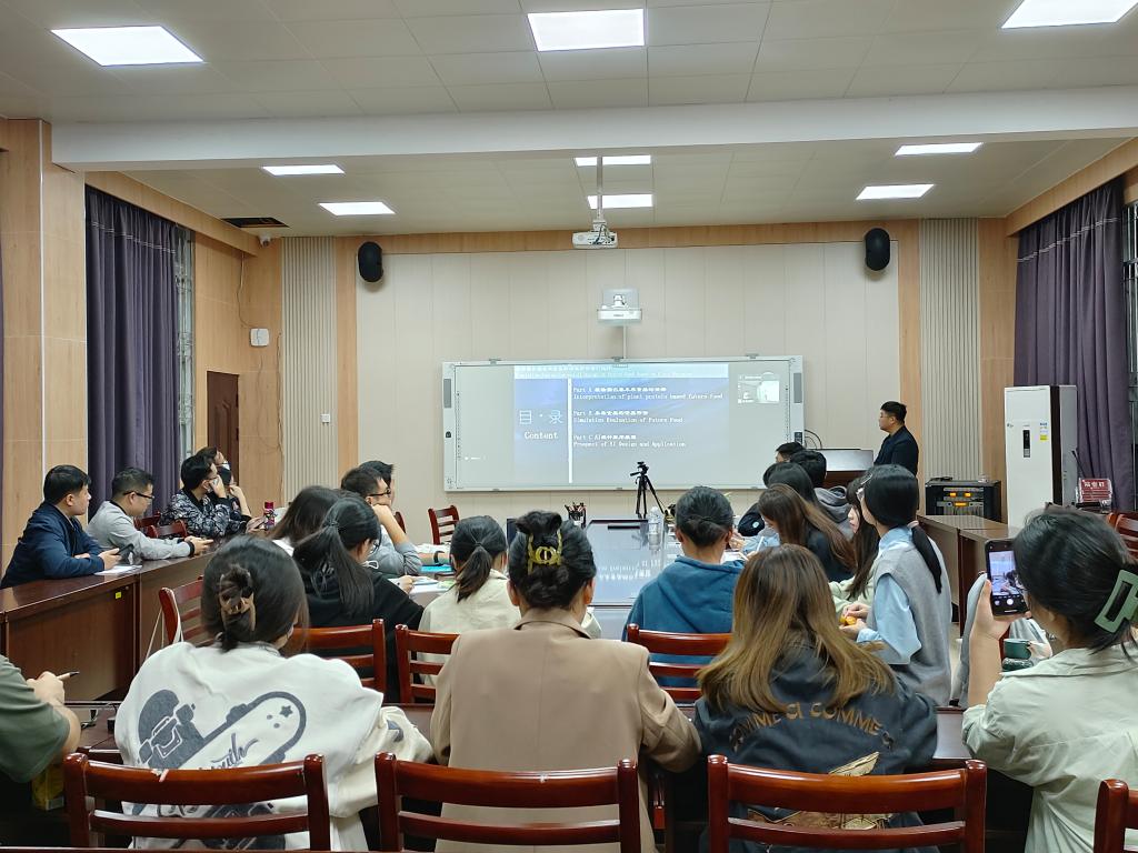 学术报告分为植物蛋白基未来食品的诠释,未来食品的仿真评价以及Al设计应用展望三大主要内容。肖志刚教授通过大量的实验数据和实例图片,为大家介绍了植物蛋白基食品的研发原理及制作工艺。在研发过程中每一项成果都倾注了科研人员的精力和持续不断的研究攻关。肖教授的讲解清晰明了,研究思路给老师和学生带来了很大的启发。报告结束后,现场师生与肖教授积极交流探讨,现场氛围活跃,参会师生受益匪浅。