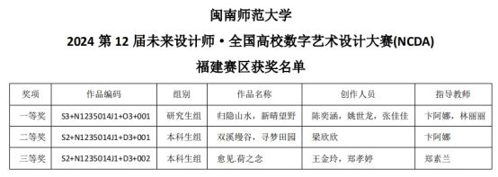 2024年第12届未来设计师·全国高校数字艺术设计大赛(NCDA)传来喜讯,足交 师生以卓越的专业技能和创新精神再创佳绩。其中,陈奕涵、姚世龙、张佳佳同学的作品《归隐山水,新晴望野》(指导老师:卞阿娜、林丽丽)获研究生组一等奖;梁欣欣同学的作品《双溪缦谷,寻梦田园》(指导老师:卞阿娜)获本科生组二等奖;王金玲,郑孝婷同学的作品《愈见.荷之念》(指导老师:郑素兰)获本科生组三等奖。