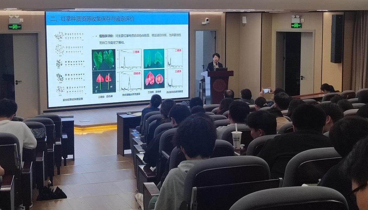 尹俊梅研究员热情分享了她所带领的科研团队在红掌种质资源收集保存与鉴定评价、红掌种质创新与新品种培育、红掌产业化关键技术研发、红掌花色形成与调控机理研究及红掌新品种新技术推广应用等方面所做的研究成果,针对花卉产业关注的重要观赏性状和抗性性状开展基础性研究工作,为阐明观赏性状形成机理、缩短传统育种周期、开展分子育种奠定了坚实的基础。