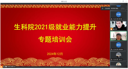 于2024年12月30日在线上成功举办2021级学生就业能力提升专题培训会,学院党委副书记陈文婷出席本次会议,会议由带班辅导员陈炜主持。