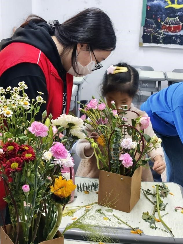活动开始前,首先由心助的工作人员开启了插花艺术课堂,为小朋友和同学们介绍了活动所用花材的名字、蕴含的寓意以及插花的搭配技巧、艺术风格和创意构思。活动现场,活动参与者们根据各自审美重构自然美学,发挥想象修剪枝叶。活动结束时,参与者们都满心欢喜地捧着自己亲手DIY的插花,成就感满满。