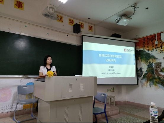 汪少芸教授系统介绍了其团队在抗冻肽、抗氧化肽、抗菌肽及活性肽方面的研究进展及产业化情况。她认为在科学研究中,基础科研要与产业相结合,最终以实现产业化为目的。她介绍说,抗冻肽可应用在鱼糜、肉糜、冰淇淋等冷链食品中,防止由于贮运过程中温度波动造成的冰晶生长而影响食品的品质;抗氧化肽可以延缓食品的氧化变质,延长贮藏期;抗菌肽可以在食品工业中部分取代化学防腐剂,从而减少食品中添加剂的使用。目前这些活性肽已经应用在一些企业生产的产品中,而且效果较好。讲座的最后,汪教授还为在场的同学指明了未来职业规划的思路。