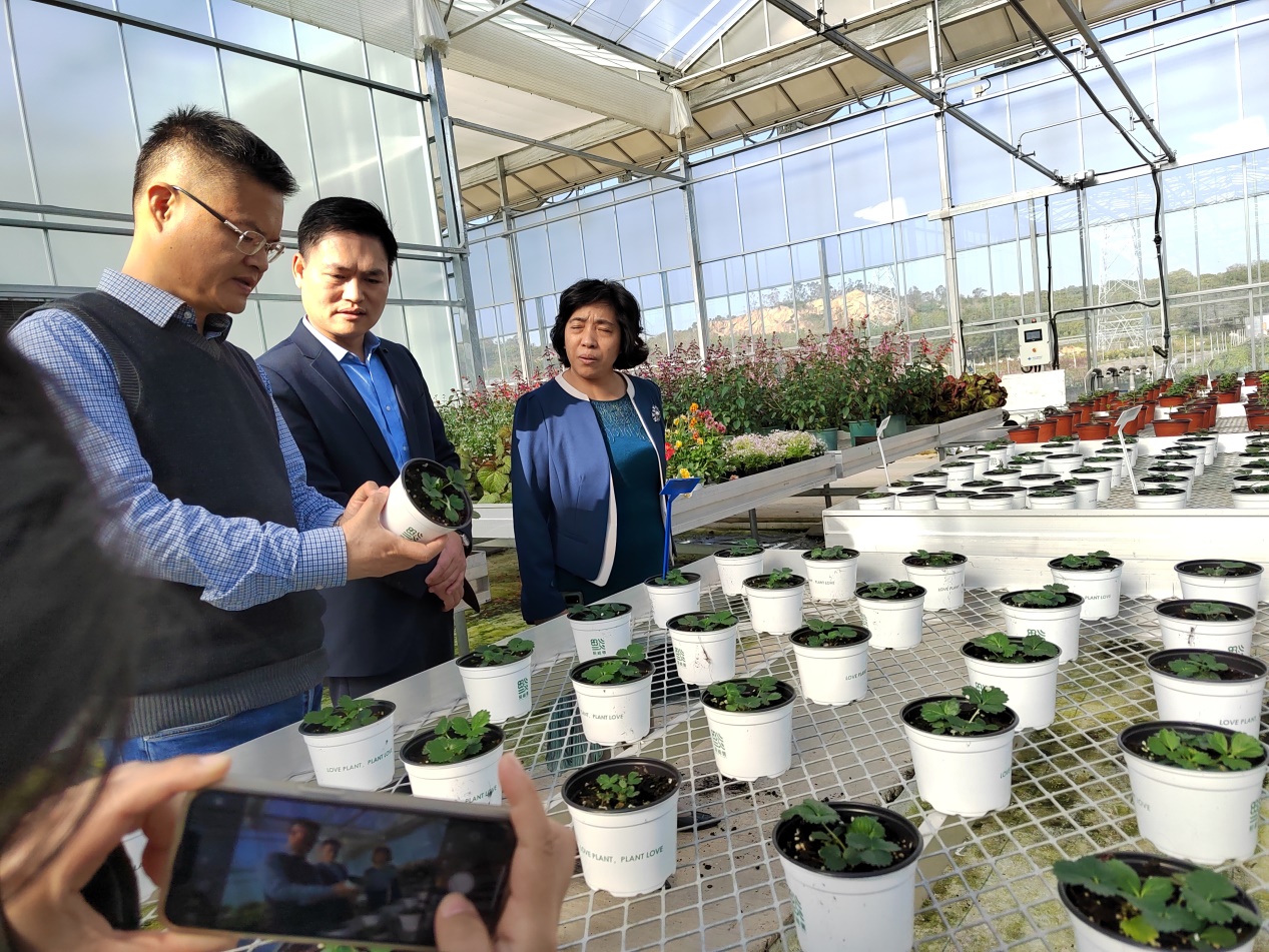走访期间,在詹瑞琪总经理介绍下,连恩德书记和陆銮眉院长一行参观了公司连栋智能温室大棚、盆花生产和盆花品种展示,并看望了正在顶岗实习19级园艺学生。