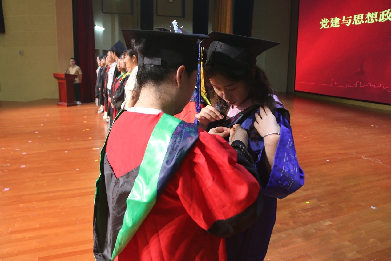 党政领导班子全体成员及部分教师代表亲手为学院2023届青年毕业生代表扣上专属定制纽扣