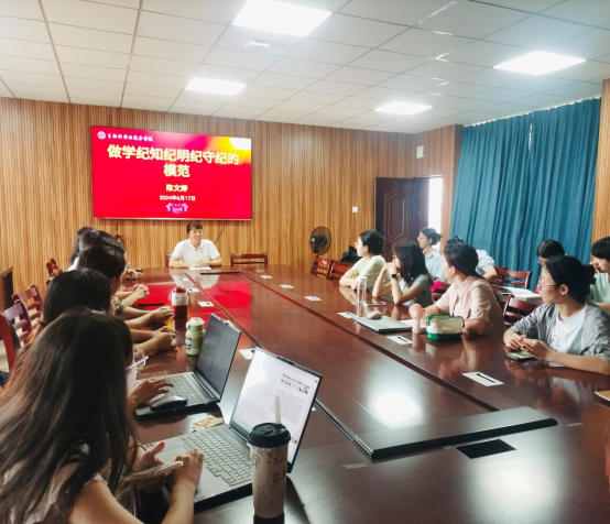 为深入学习贯彻落实习近平总书记关于全面加强党的纪律建设的重要论述,推动党纪学习教育走深走实,教育引导学生党员将遵规守纪刻印在心,铭记于行。2024年6月17日下午,学院党委副书记陈文婷为学生第五党支部及研究生党支部讲授题为《做学纪知纪明纪守纪的模范》的专题党课。