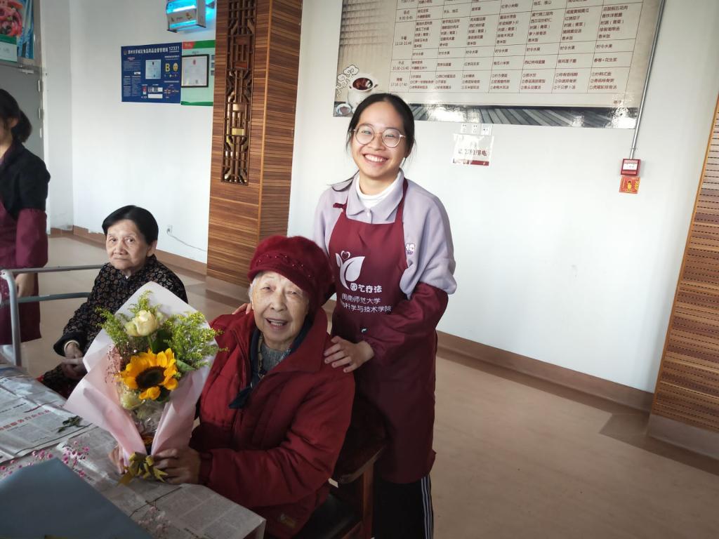 活动所用的向日葵是陈郑镔老师指导18园艺的学生亲手种植的,是学生理论知识与实践成果相结合的智慧结晶。本次活动在关心老人朋友们,帮助他们发挥想象力和创造力,享受生活的乐趣的同时,也在指导着园艺专业的学生们做到知行合一,并为他们展示了园艺疗法所起到的重要作用和价值意义。活动结束后,老人们开心地向志愿者们展示她们的作品,并与其合影留恋。