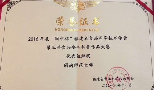 的薛山老师的视频作品《舌尖上的僵尸肉》以及14级食品安全专业周艳红同学的漫画作品《周大仙牌泡面》和以14食品专业宋琴同学为代表的视频作品《我在寻找的路上——网购食品维权情景剧》夺得了本次大赛的一等奖;其中王淑静,王婧,郑志颖,肖晶宁等同学的相关作品荣获二等奖;朱琪庆,胡明凤,郑怡娴等同学的作品获得了三等奖;王怡,曾培等同学的作品获得优秀奖。特别值得一提的是薛山老师还荣获了“闽中杯”2016年度福建省食品科学技术学会优秀学术论文奖三等奖。