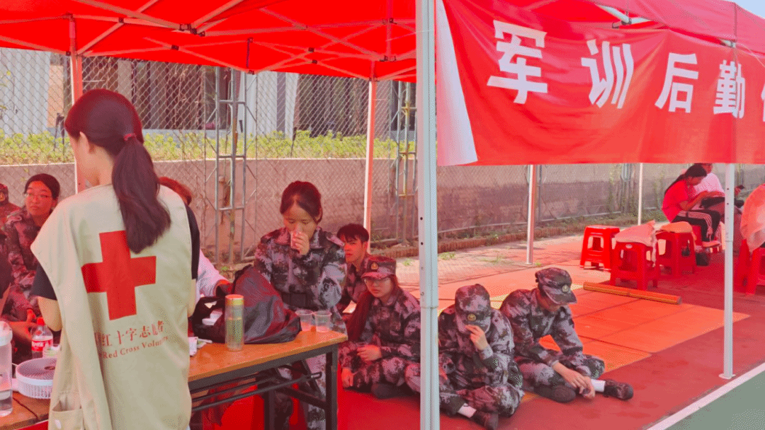 训练场上,除了刻苦训练的同学们,还有一群默默付出的身影——红十字志愿者。他们穿梭在队伍之间,时刻关注着同学们的身体状况。看到有同学因高温而脸色苍白,他们立刻上前,递上清凉的水,用温和的话语安抚,还熟练地为有小擦伤的同学消毒、包扎。在同学们训练疲惫时,志愿者们会送来精心准备的医疗箱,里面的防暑药品、创可贴等物资,为同学们的军训生活筑牢了健康防线。他们用专业与耐心,让军训场充满了温情,也让同学们能更安心、更有力量地投入到训练中。