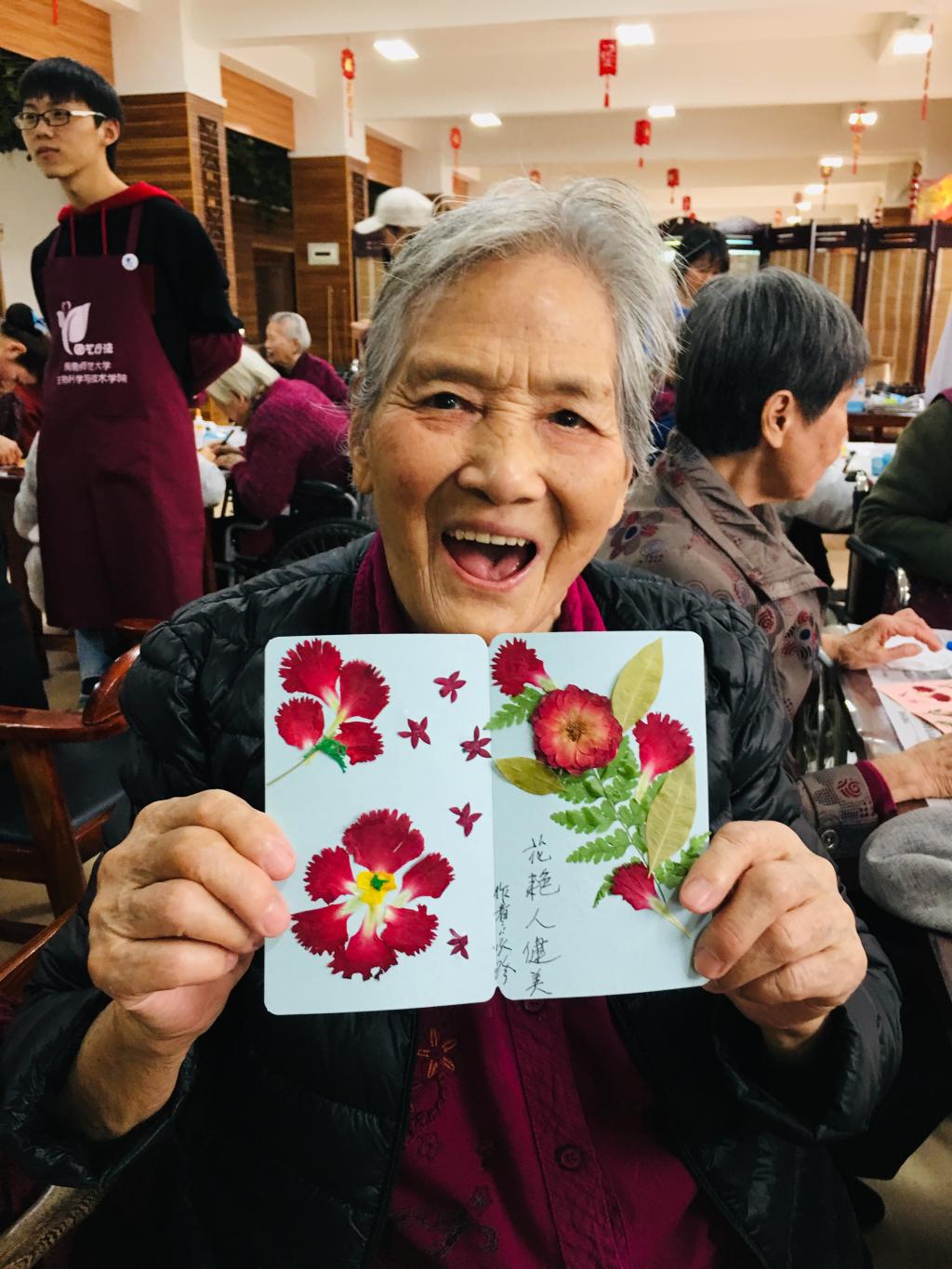 生科院园艺专业师生走进正兴新来福养护院,为老年人带来园艺疗法项目的最后一个活动“爱的传递——压花贺卡的制作”。这些平均年龄已经八十多岁的爷爷奶奶们都十分积极参与,用自己的独特想法,在贺卡上布局,贴花,写字等等。在同学们和工作人员相互配合下,爷爷奶奶们在与植物建立联系过程中发挥了自己的才能和艺术天赋,同时也使精神得到放松、减缓疲劳。